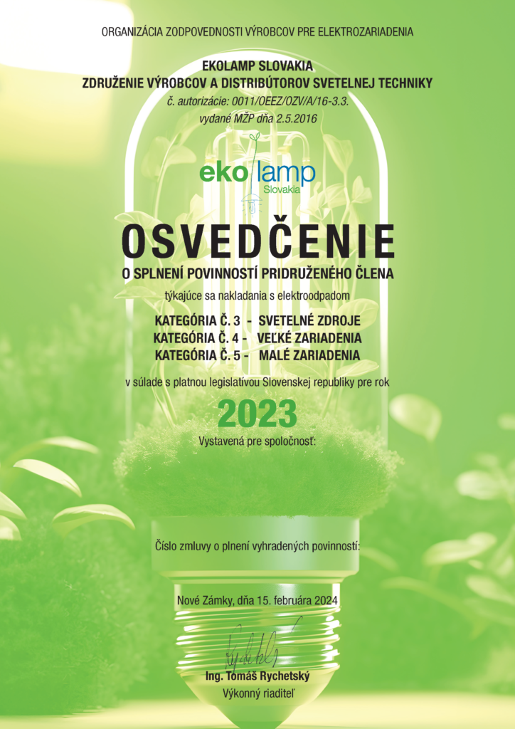 Tieto grafické návrhy osvedčení boli vytvorené pre organizáciu zodpovednosti výrobcov Ekolamp Slovakia, ktorá zabezpečuje ekologické nakladanie s elektrozariadeniami a svetelnými zdrojmi.