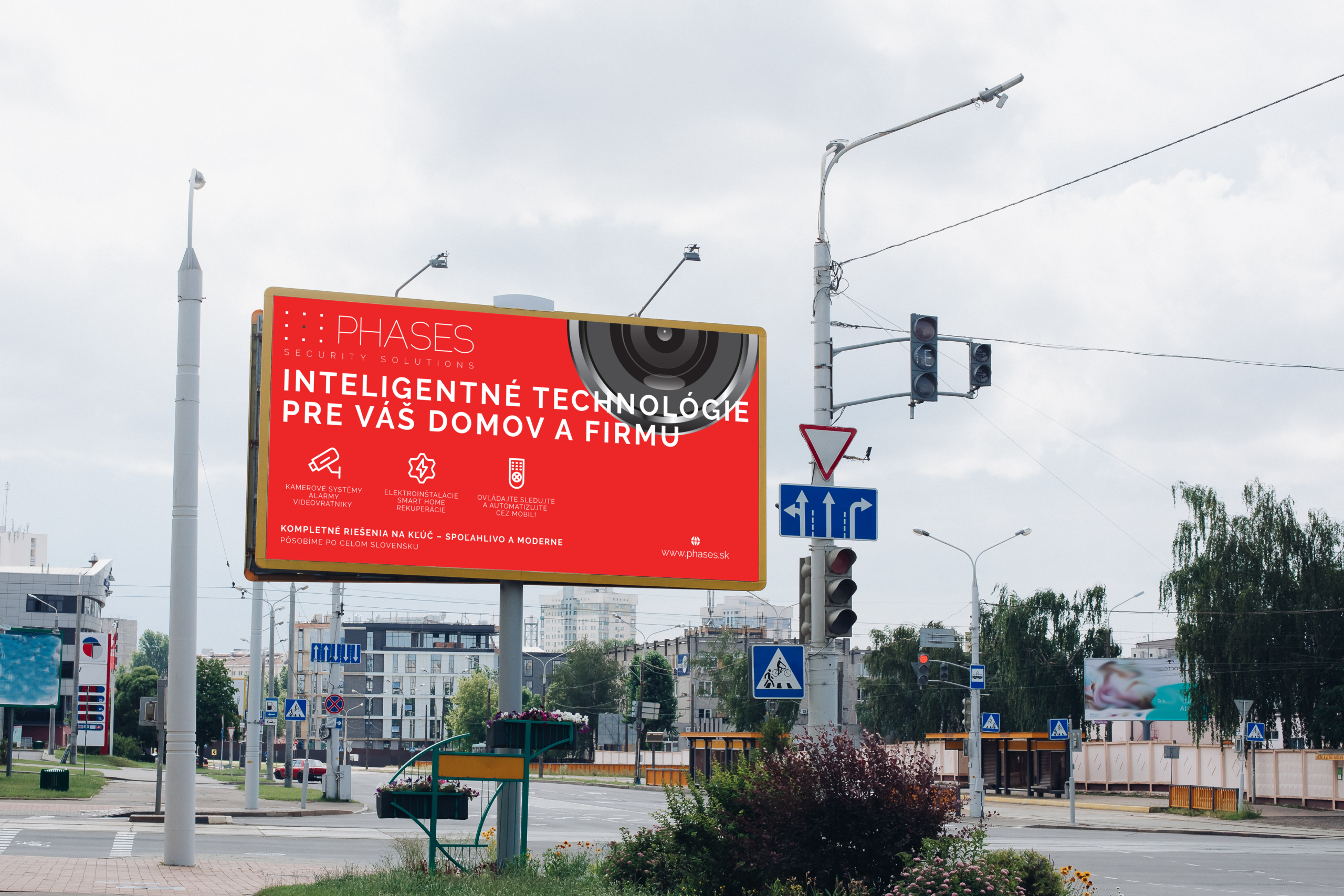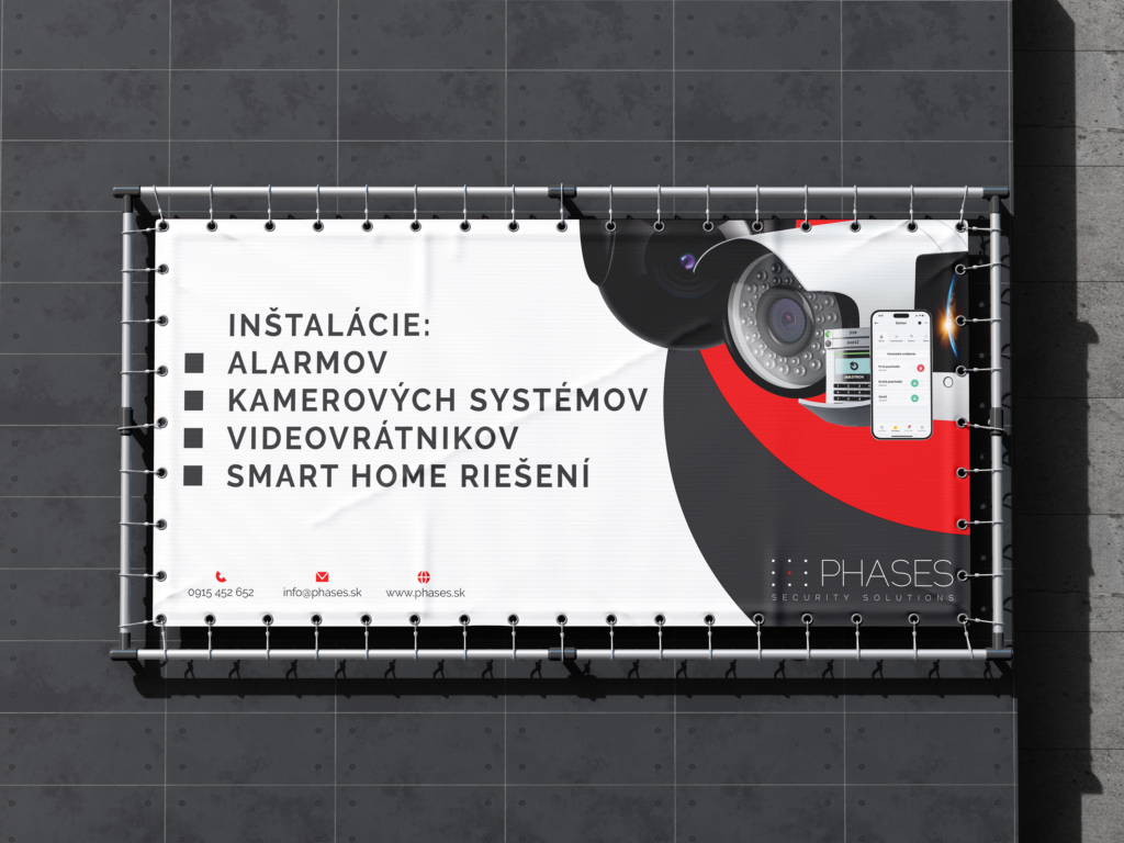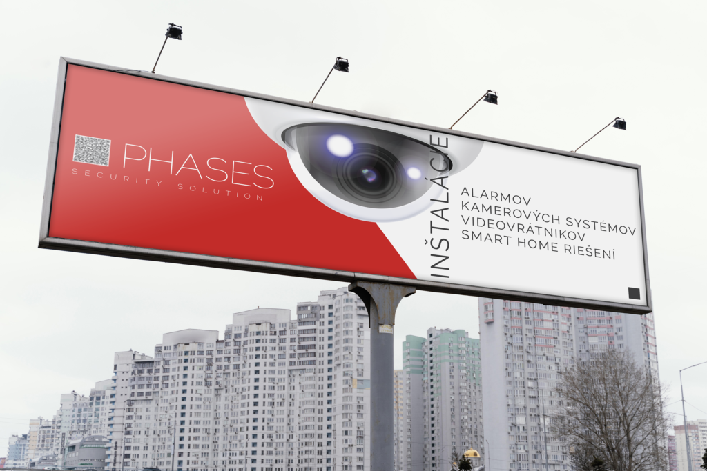 Tento vizuál predstavuje jadro komunikácie značky PHASES – spoľahlivé technológie, presné riešenia a schopnosť ochrániť priestor s elegantnou jednoduchosťou. Dominantná červená plocha funguje ako silný signálny prvok, ktorý okamžite pritiahne pozornosť v mestskom prostredí.